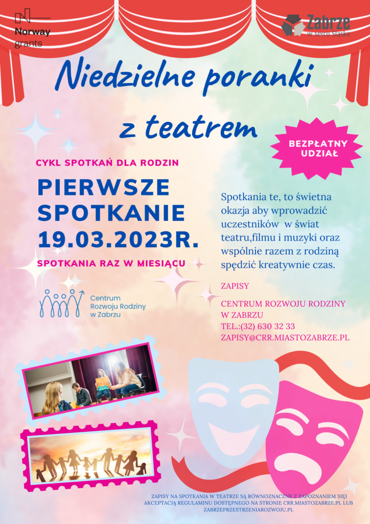Z Kulturą” [“With Culture”] The Teatr Nowy [New Theatre] in Zabrze Friends Association cooperating with the Family Development Centre in Zabrze invite the inhabitants to participate in a cycle of meetings for families called “Sunday mornings with the theatre”. The event is held as part of the project „City as Space for Development”, funded from the Norwegian Financial Mechanism for the years 2014-2021.